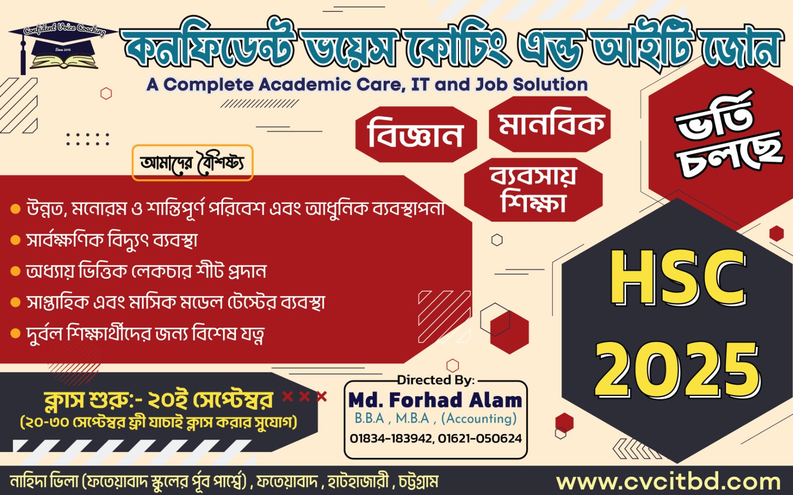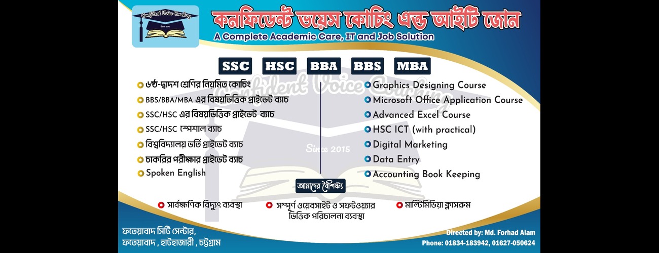 কনফিডেন্ট ভয়েস কোচিং এন্ড ট্রেনিং সেন্টার এর সার্বিক পরিচালনায় ছাত্র-ছাত্রীর মানসম্মত শিক্ষা প্রদানের উদ্দেশ্যে প্রতিষ্ঠিত। বাস্তব, যুগোপযোগী ও গুণগত মানসম্পন্ন শিক্ষা প্রদানই এই প্রতিষ্ঠানের প্রধান লক্ষ্য।